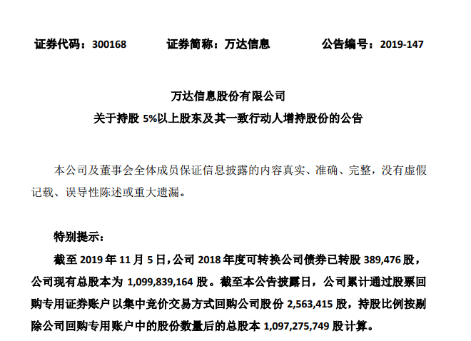 万达信息于11月6日收到收到持股5%以上股东国寿资产出具的其受托管理的中国人寿相关账户的增持情况告知函,中国人寿及其一致行动人于10月29日-11月6日期间通过集中竞价方式增持了3.2047%公司股份。本次增持后,中国人寿及其一致行动人持股比例增至18.2301%。