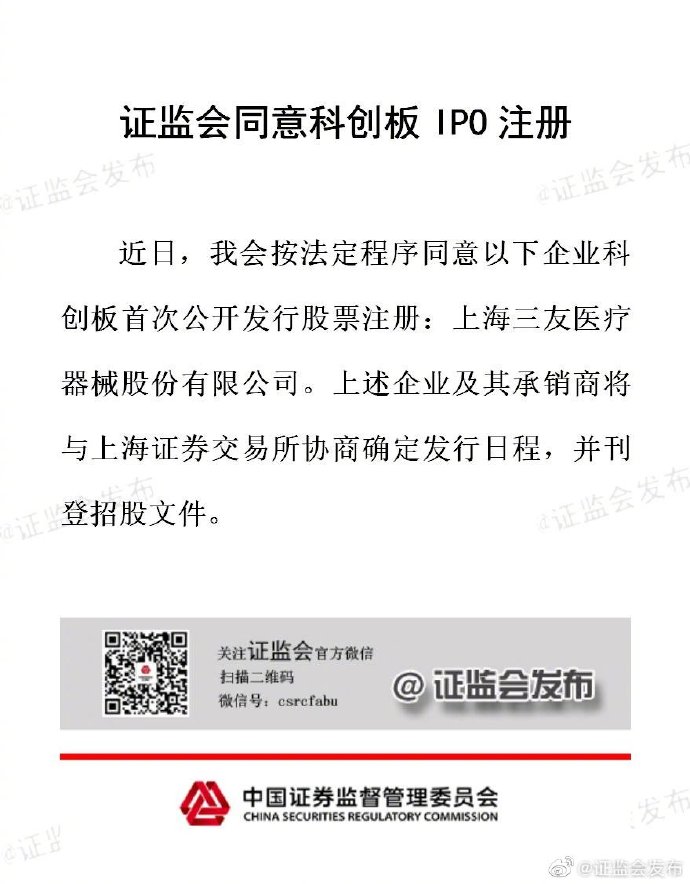 e公司讯,近日,证监会按法定程序同意以下企业科创板首次公开发行股票注册:上海三友医疗器械股份有限公司。上述企业及其承销商将与上海证券交易所协商确定发行日程,并刊登招股文件。
