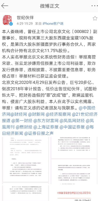 4月29日晚,认证为北京世纪伙伴文化传媒股份有限公司的微博账号“世纪伙伴”,以曾任北京文化(000802)副董事长的娄晓曦名义发出微博,实名举报北京文化系统性财务造假,并举报北京文化高管宋歌、张云龙涉嫌背信损害上市公司利益罪,欺诈发行债券罪等,微博中称其举报材料已获证监会受理。