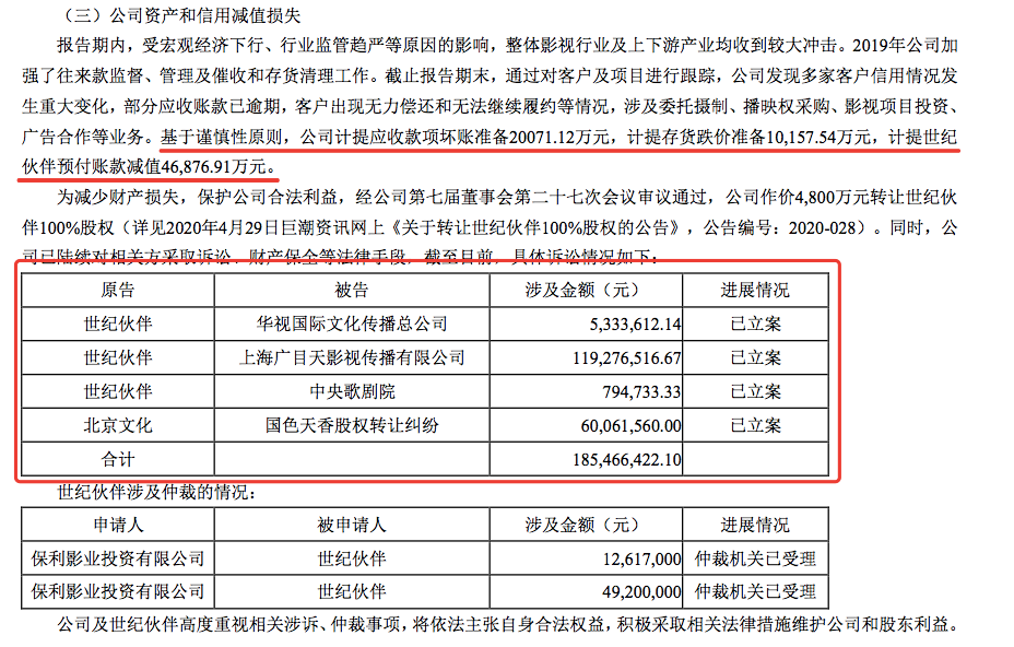 基于谨慎性原则,北京文化计提款项坏账准备2亿元,计提存货跌价准备1.01亿元,计提世纪伙伴预付款减值4.69亿元。