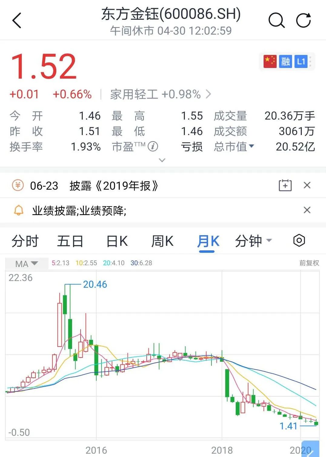 截止4月29日下午收盘,东方金钰最新股价1.51元/股,总市值仅为20.39亿元。股价年内累计跌幅达45.49%,出现了2008年以来的新低。而在此之前的4月18日,公司发布了关于公司股票可能被实施退市风险警示的第三次风险提示公告。