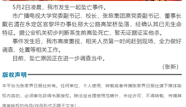 通告称,5月2日凌晨,张家界市广播电视大学党委副书记、校长,张旅集团原党委副书记、董事长戴名清在永定区官黎坪办事处邢大公路高架桥坠落,经确认其已无生命特征。