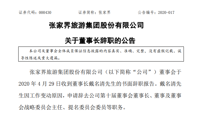 e公司记者了解到,张家界市委于4月23日明确调动,戴名清主持完公司年度董事会,审签年报和一季报,于4月29日下午向董事会提交辞呈。公司依法于4月30日对上述事项进行信息披露,上传公告和辞职信。