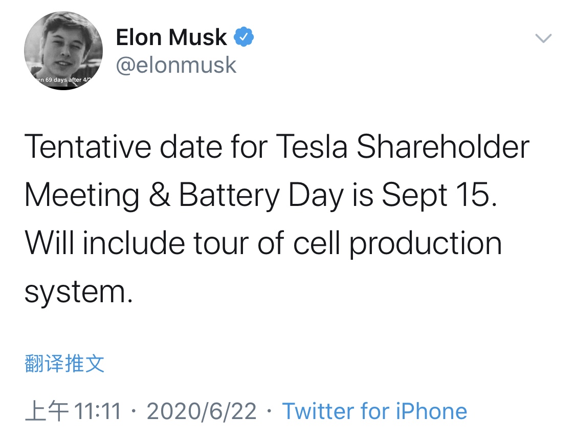 特斯拉CEO马斯克:暂定于9月15日召开特斯拉年度股东大会和电池日活动