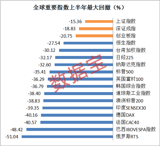 在获得优异表现的同时,A股在上半年的全球股灾中回撤幅度最小,风险最低。证券时报·数据宝统计显示,上半年创业板指数最大跌幅为20.75%,上证指数、深证成指的最大跌幅均不超过20%,相比之下,出于对疫情加速蔓延的恐慌,三月全球主要市场指数纷纷创下最快跌入技术性熊市的记录,俄罗斯、巴西、法国、德国指数最大跌幅超过40%。