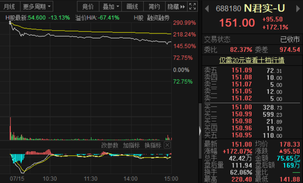 周三科创板新上市的君实生物大幅震荡,开盘价216元,盘中瞬间冲高220.4元,随后大幅下滑,截至收盘,报收151元,较最高点跌去逾31%,成交75.65亿元,换手率62.06%。港股君实生物也是开盘初瞬间冲高涨逾6%后大幅回落,至收盘大跌13.13%。