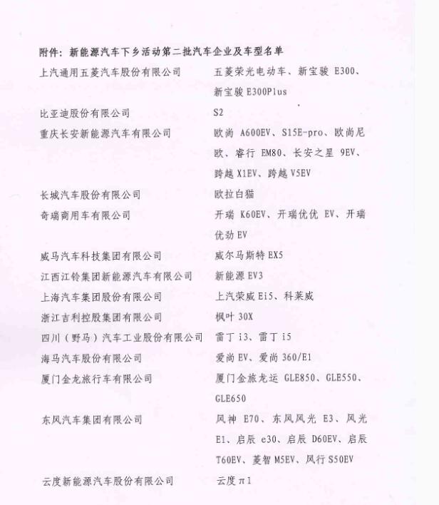 e公司讯,今日,中国汽车工业协会公布了第二批参与新能源汽车下乡活动的企业和车型名单。名单包括上汽通用五菱、比亚迪、长安汽车、长城汽车、奇瑞商用车等在内的14家企业,及其旗下的逾30款车型。