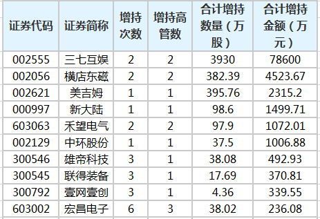 e公司讯,近10个交易日(4月23日~5月11日)共有36家上市公司股份获高管增持。从增持金额看,近10日增持金额最多的是三七互娱,累计增持3930万股,增持金额合计7.86亿元;其次是横店东磁,增持量为382.39万股,增持金额4523.67万元。