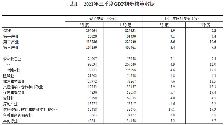 e公司讯,国家统计局发布的2021年三季度GDP初步核算数据显示,三季度住宿和餐饮业GDP同比增长5.7%,房地产业GDP同比下滑1.6%,批发和零售业GDP同比上涨7.6%。
